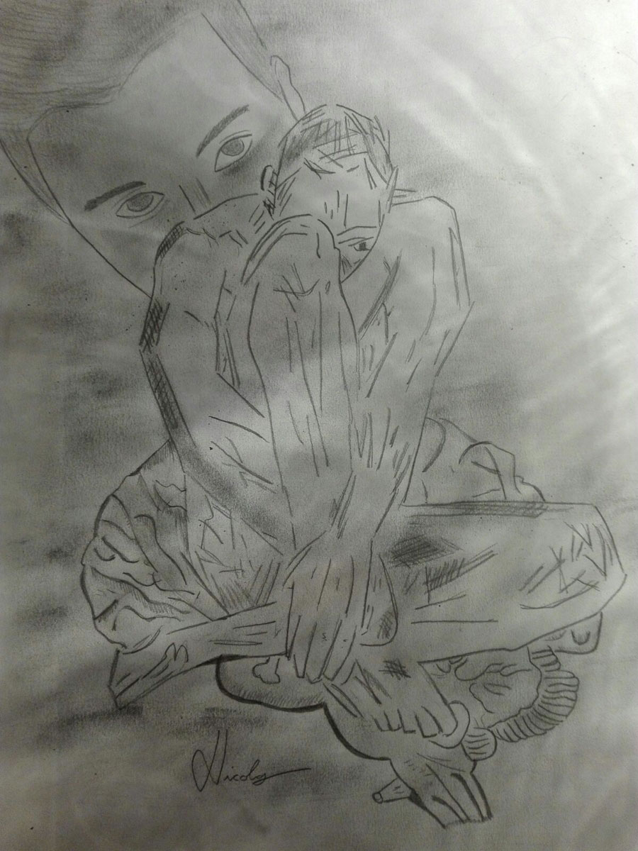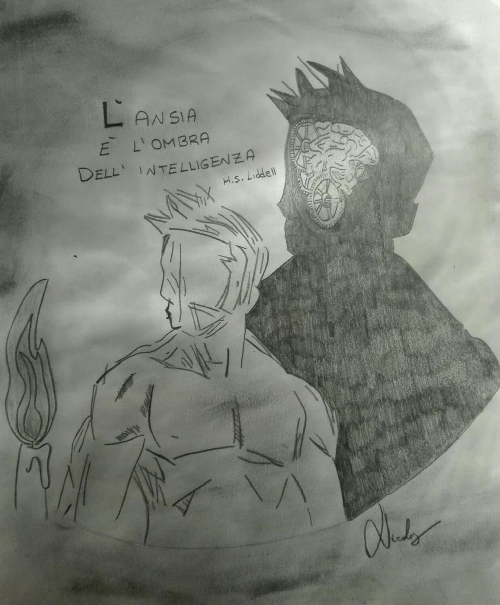 “Il lavoro su se stessi è il lavoro più difficile ma ci dà la possibilità di intraprendere un meraviglioso viaggio nella propria interiorità. Nel disegno in alto viene tolta la maschera della tristezza che viene sostituita da quella della gioia. Gli omini stanno lavorando sul corpo, specialmente sul cuore, organo associato al dolore. Infine il personaggio che impugna il martello indica la forte volontà di cambiare e lottare contro le proprie paure”