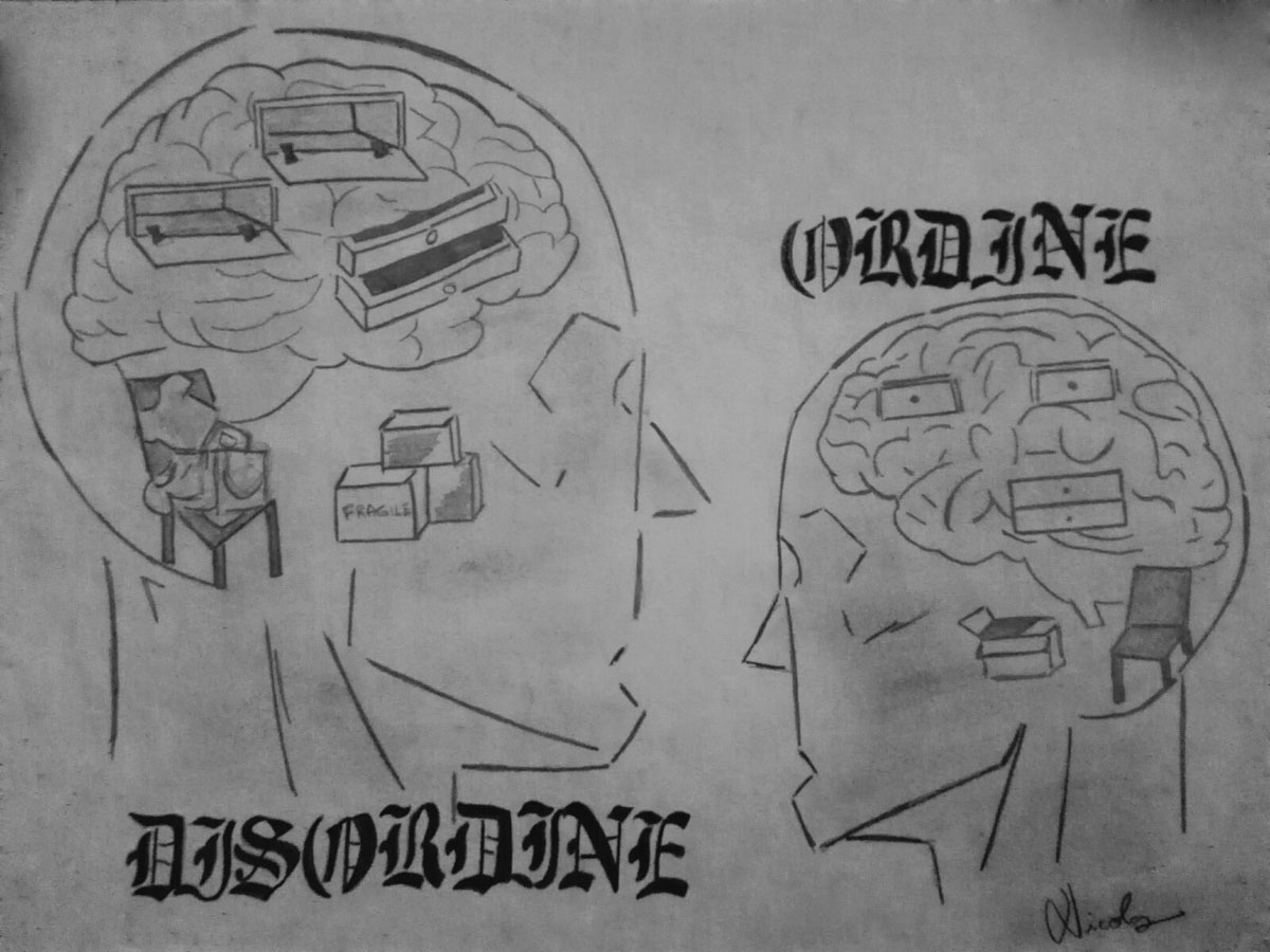 “Nella rappresentazione a destra i cassetti delle emozioni sono aperti e disordinati, la sedia rappresenta tutte le bugie e i problemi che cerchiamo di nascondere a noi stessi, mentre gli scatoloni chiusi rappresentano i traumi che cerchiamo di “allontanare”. L’immagine a destra ritrae le stesse cose dopo un percorso psicologico: le emozioni sono state gestite e rimesse in ordine, i problemi portati alla luce e affrontati e i traumi accettati, infatti gli scatoloni sono aperti e non fanno più paura”